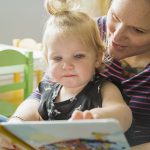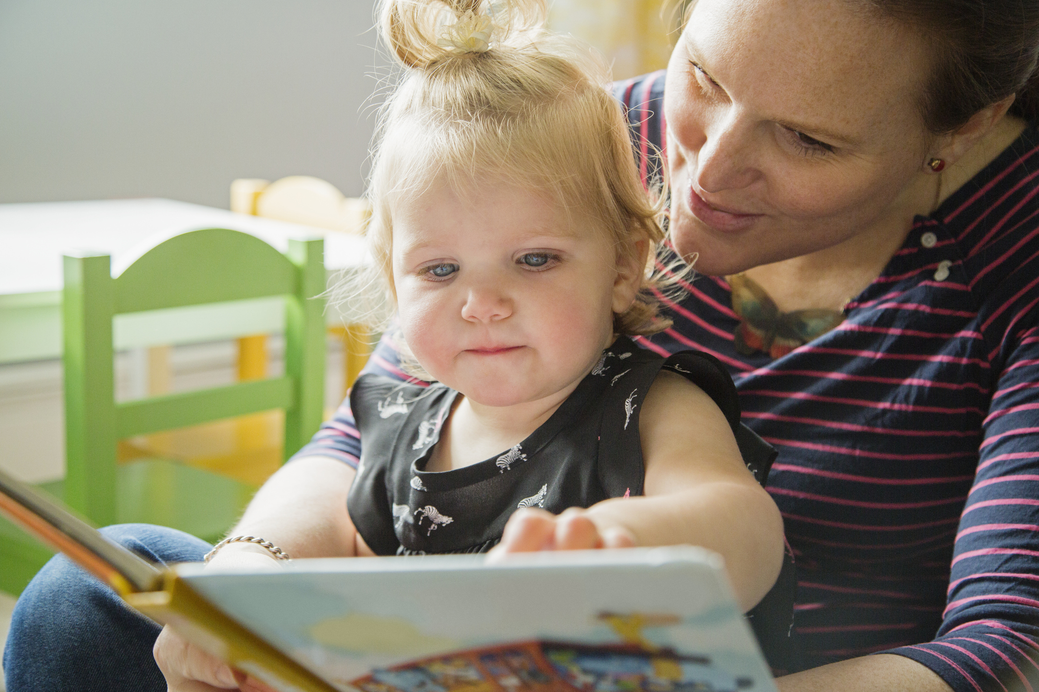 Képeskönyvet nézeget. A könyvek egyszerű cselekvést is ábrázolhatnak, de a lényeg a figura felismerése.