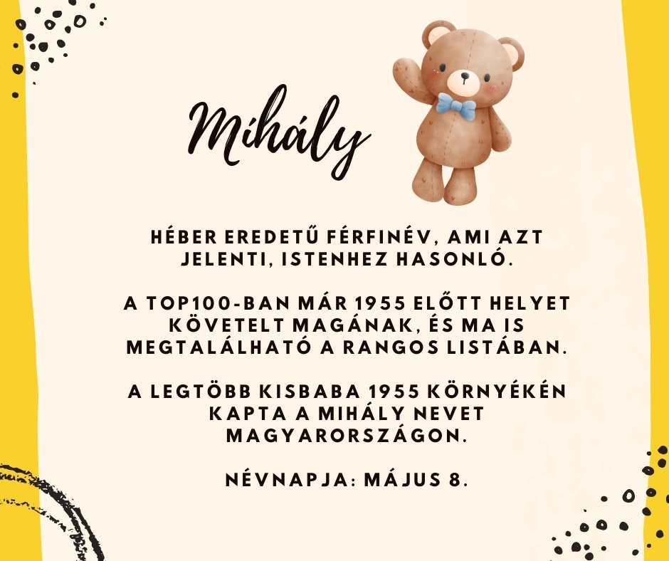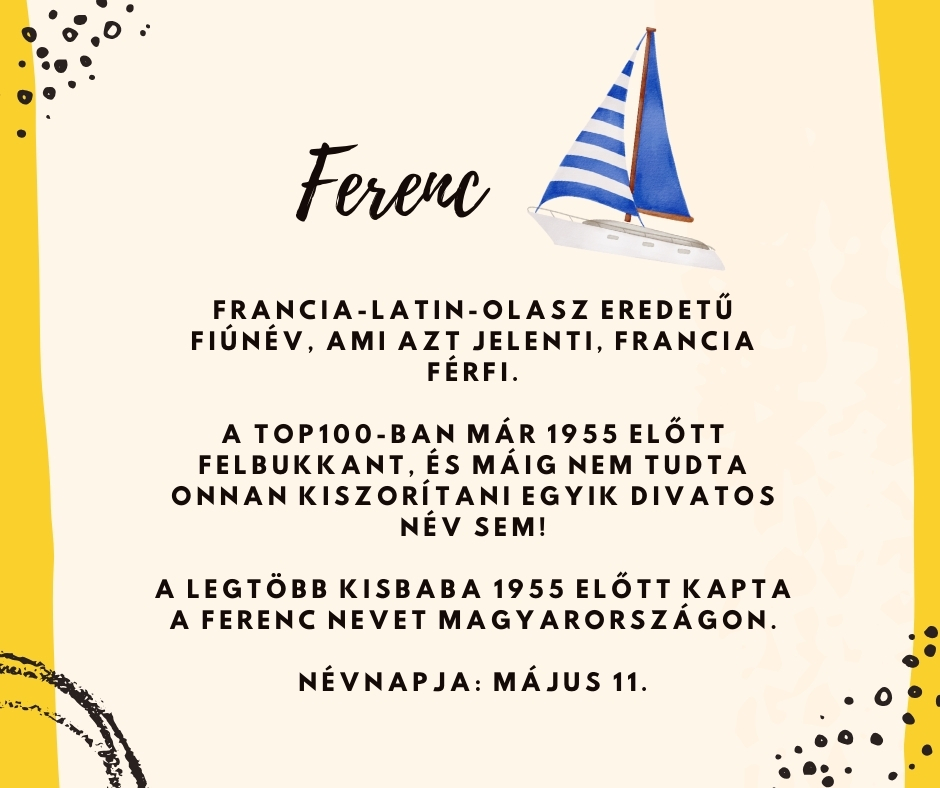 A sorban a 6. egy csodaszép férfinév, ami 70 éven át szüntelenül ott volt a Top100-ban, most először viszont kiszorították onnan a feltörekvő fiúnevek. Igazán kár, hogy búcsúznunk kellett tőle!