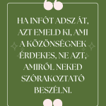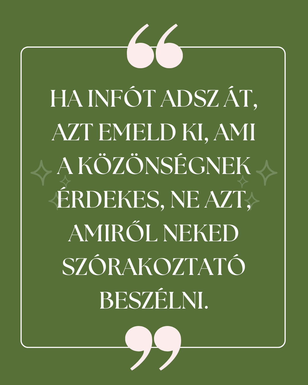 Ha előadást tartasz, gondold át, hogy mi az a fő üzenet vagy jó tanács, amit a résztvevők „hazavihetnek magukkal”. Legyen eze gy röviden megfogalmazható, praktikus, a későbbiekben is egyszerűen felidézhető és alkalmazható tipp, trükk, infó.