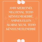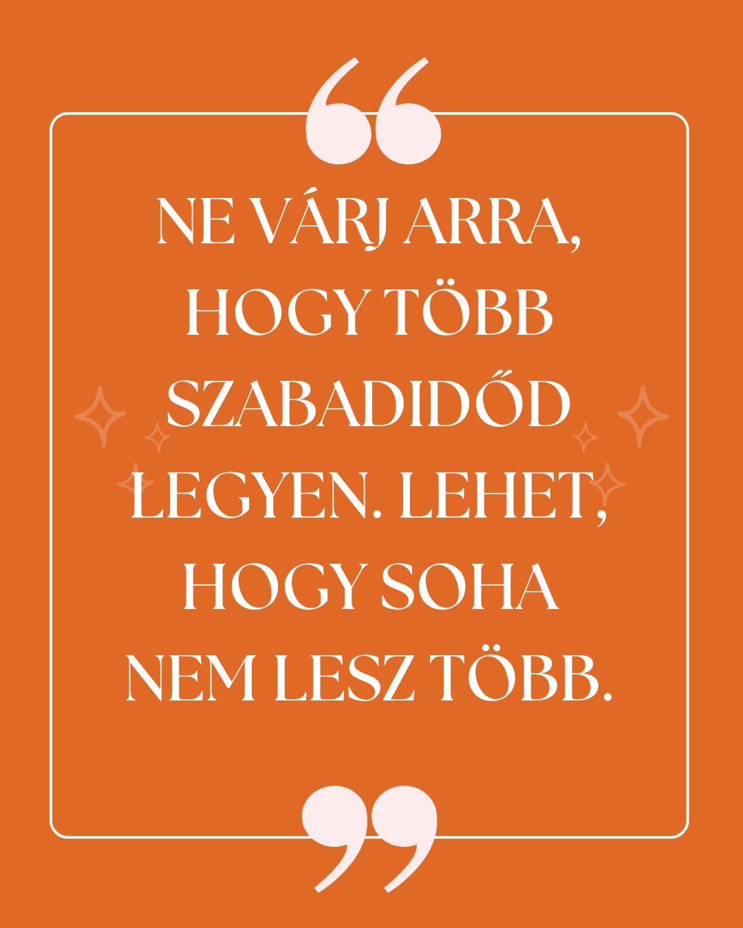 Csináld meg most, amit szeretnél, igyekezz rá kiszorítani az időt. Kezdd el ennek kitalálását, helyezd magadat előtérbe.