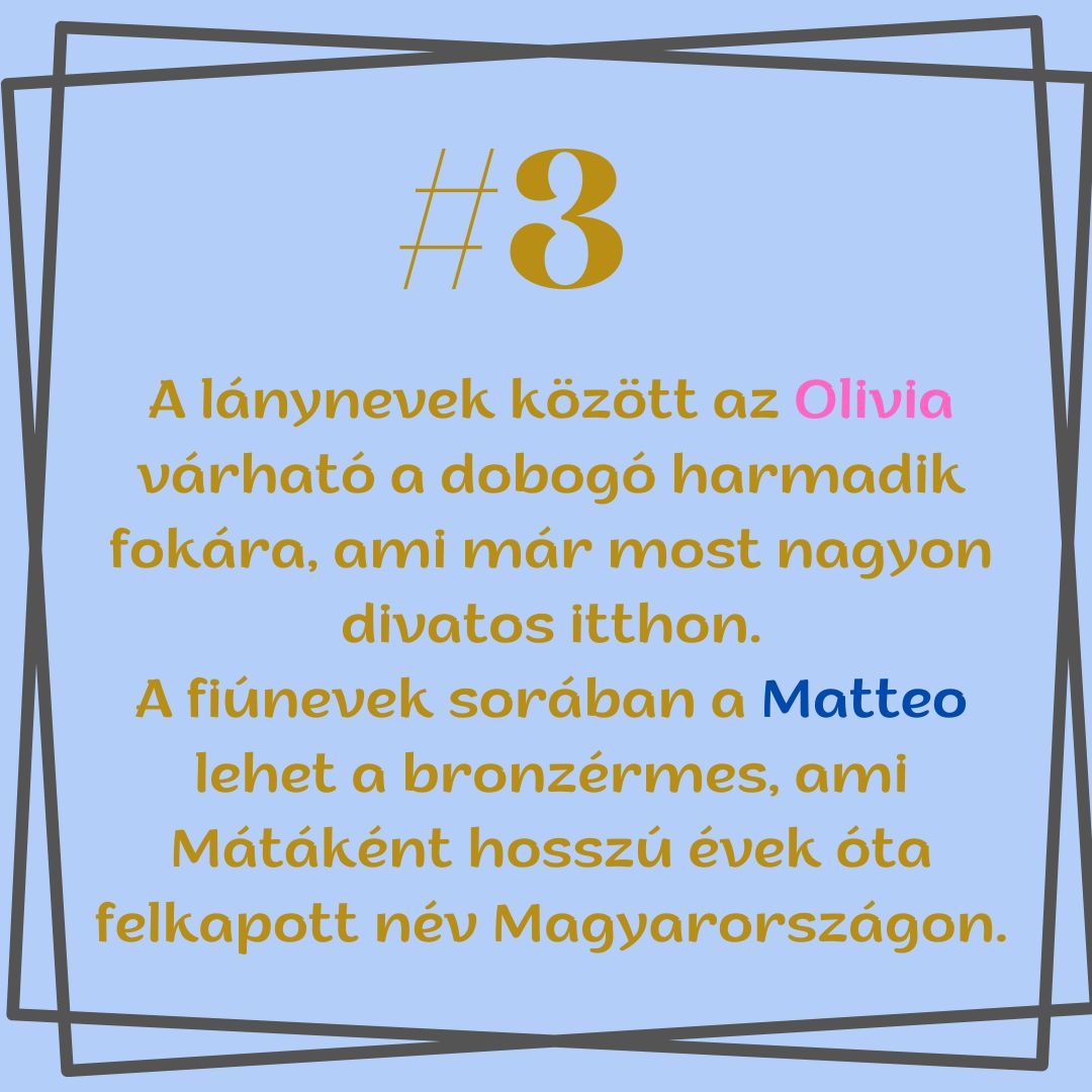 A Hanna nagy valószínűséggel búcsút vehet nemcsak az első helytől, hanem a Top10-től is. Helyette egy másik H-betűs lánynév bukkan fel majd a rangsorban. A fiúnevek között említésre sem kerül a most aranyérmes Dominik, még feljebb lép a listán azonban az Olivér és ígéretes jövő áll a Máték előtt.