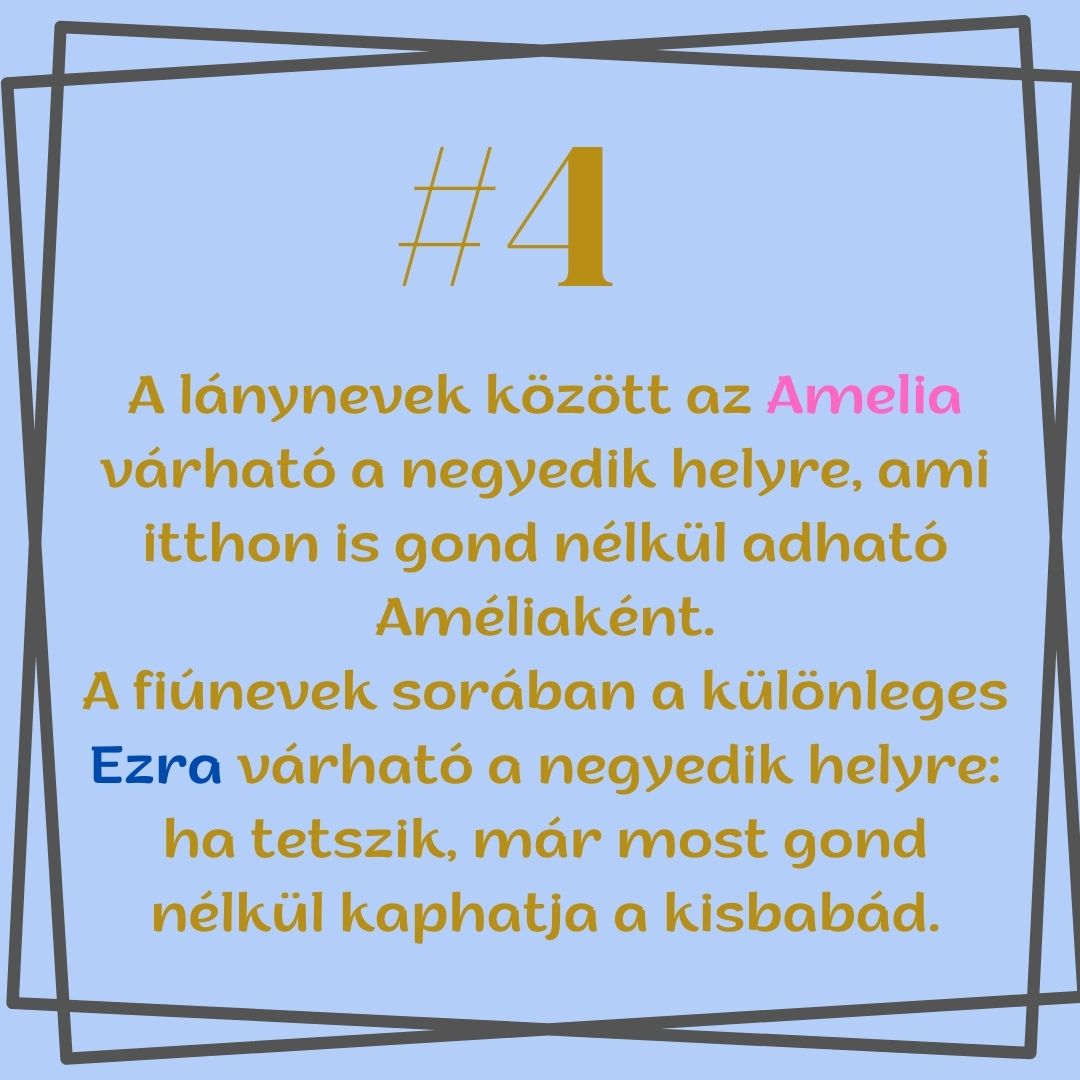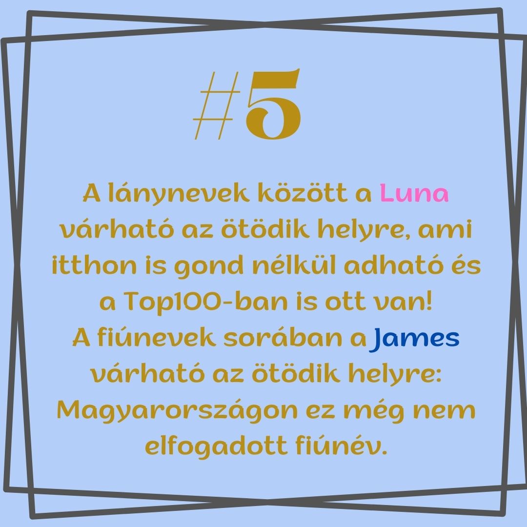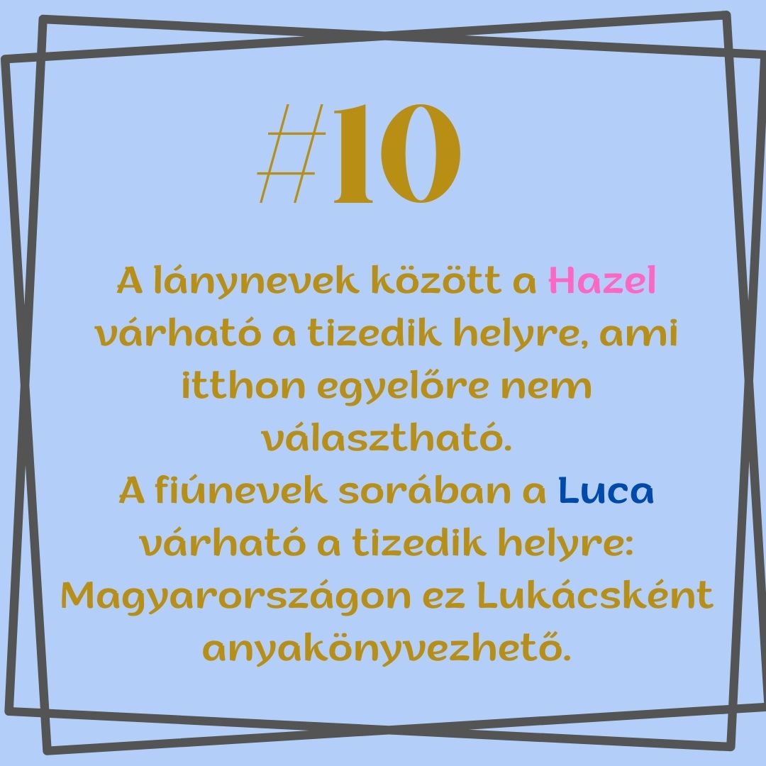 Mint mondta, a névválasztás háza táján 10 év hosszú idő: az, ami most még az élmezőny közelébe sem jutott, könnyen lehet, hogy egy évtized leforgása alatt aranyérmessé növi ki magát. Az ő meglátása szerint óriási változás várható a névadási trendekben, ami bizony Magyarországot is eléri majd.