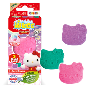 Többféle színű cuki fürdőgolyó lapul a Hello Kitty fürdőgolyók dobozában. Vegán, SLS-mentes termék, kisebbek bőrére is alkalmas.