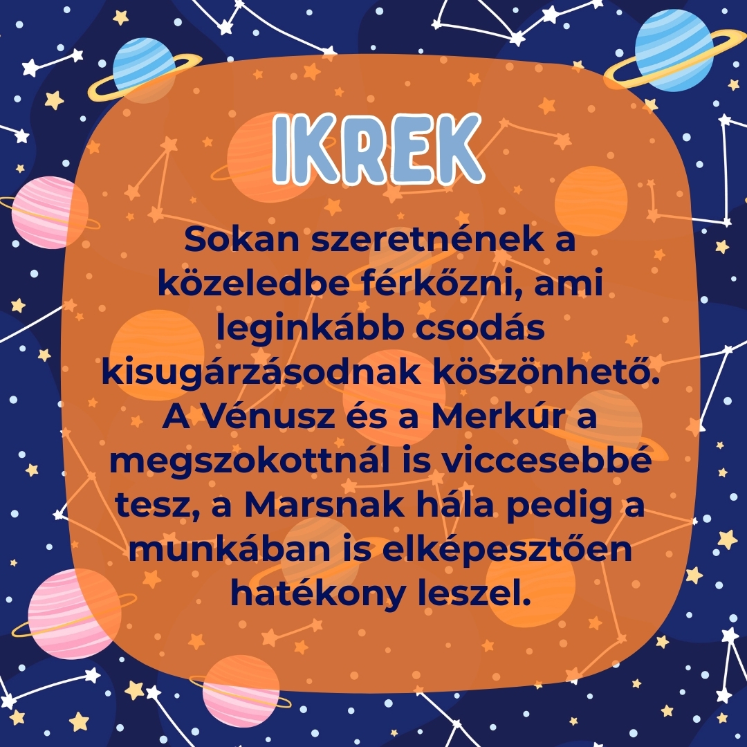 Minden csillagjegyben felerősödik a vágy arra, hogy kellő figyelmet kapjon és része legyen a megérdemelt elismerésben. Az előrejelzés szerint különösen a Tűz elemű jegyek, azaz a Kos, az Oroszlán és a Nyilas, valamint az Ikrek és a Mérleg törekszik arra, hogy a kapcsolatai a megszokottnál is intenzívebbek legyenek.