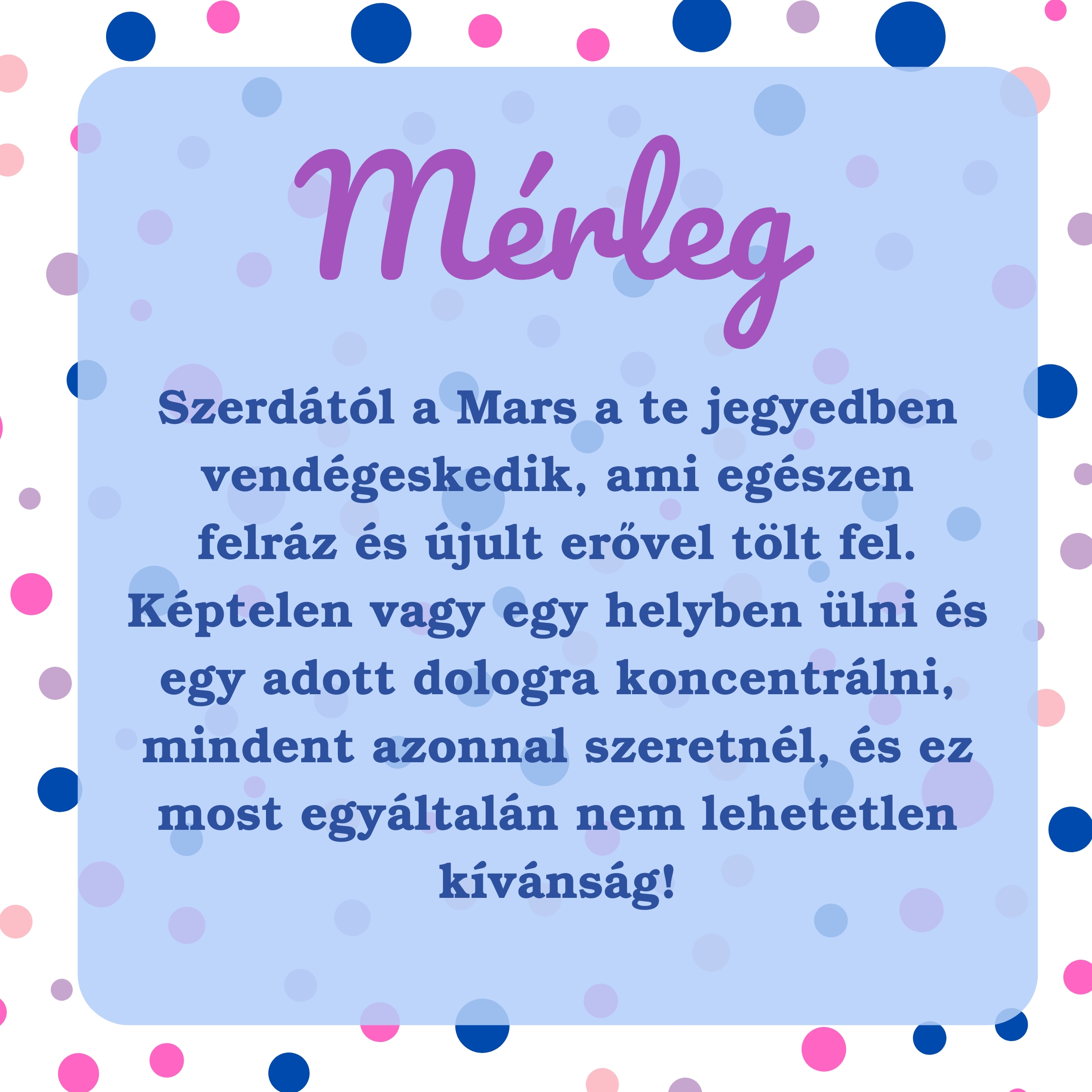 A hét egyik legfontosabb eseménye az lesz, hogy a mindig egyensúlyra törekvő Mérleg jegye vendégül látja a harcias és tettre kész Mars bolygót, ami mindenkit támogat abban, hogy helyes döntéseket hozzon és határozottan, de diplomatikus módon álljon ki magáért.