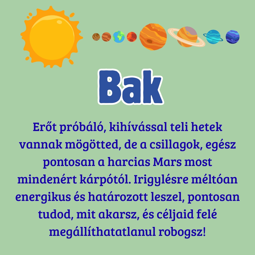 Hétfőn a harcias Mars belép a Bak jegyébe, ami konkrét, kézzel fogható megoldásokat és eredményeket vár, sosem éri be az ígéretekkel. Ennek a bolygómozgásnak köszönhetően különösen céltudatossá és hatékonnyá válnak a Bikák, a Szűz jegyűek és a Bakok. Sok levegőben lógó ügy végére pont kerülhet most, függetlenül attól, melyik jegyben születtél!
