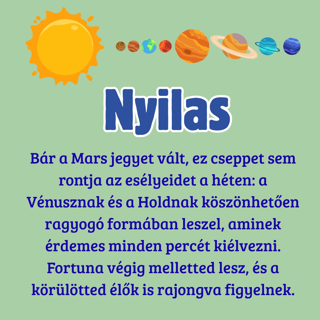 A hét közepe is tartogat egy fontos változást: a Nyilasban járó Nap kihívásokat ígérő fényszöget zár be a Halakban vendégeskedő Szaturnusszal és Neptunusszal egyaránt. Ez mindenkit lassításra és számvetésre ösztönöz, amit leginkább az Ikreknek, a Szüzeknek, a Nyilasoknak és a Halaknak érdemes megtenni.