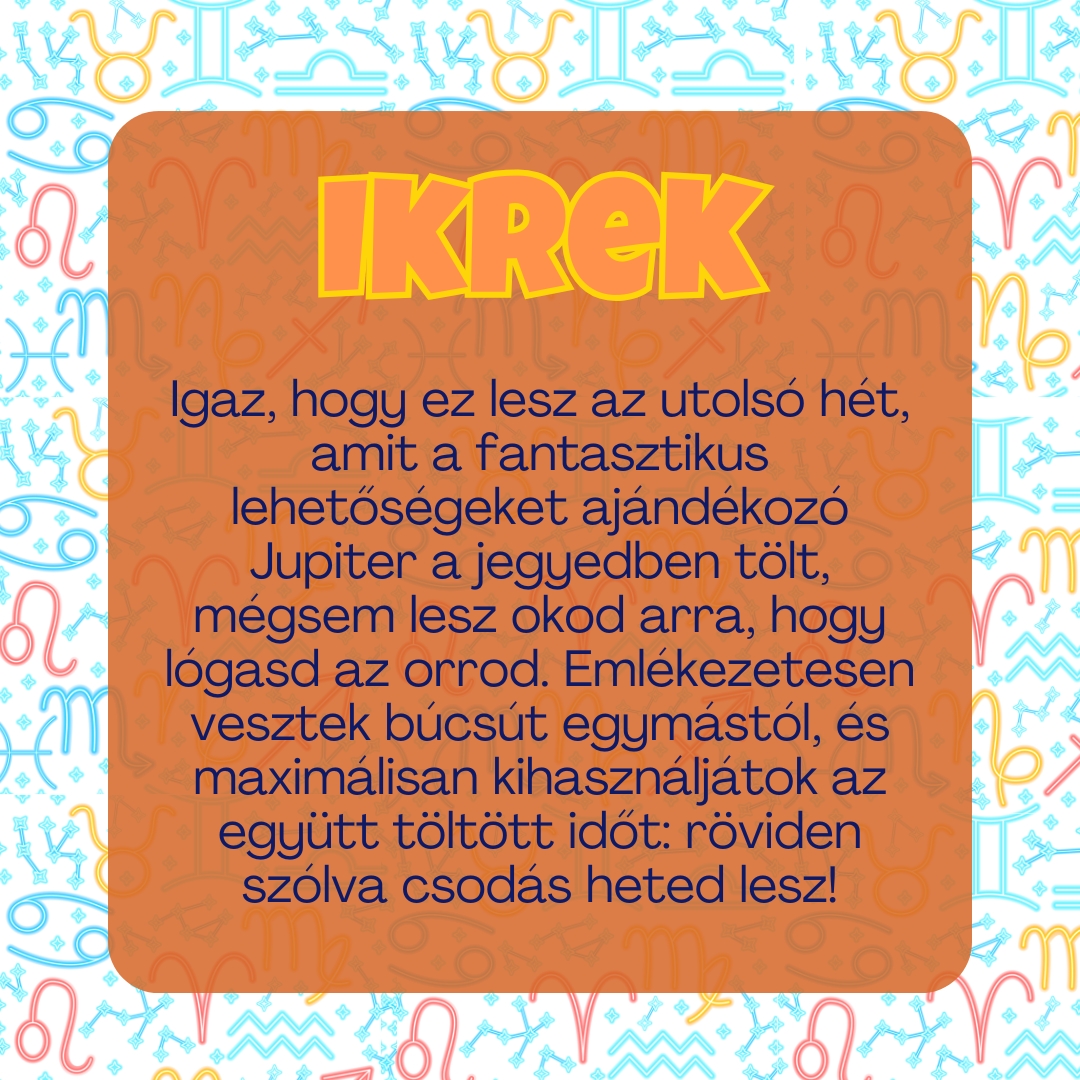 A június 2. és 8. közötti hét éppen ebből adódóan egy fejezet lezárását jelenti, ami nagyjából egy évvel ezelőtt vette kezdetét, amikor a Jupiter az Ikrek jegyébe lépett. A Jupiter június 8-án méltón búcsúzik az Ikrek jegyétől: együttáll a kommunikáció és a kapcsolatok bolygójával, azaz a Merkúrral, ami ígéretes találkozásokat, remek ötleteket, előrevivő megérzéseket hozhat.