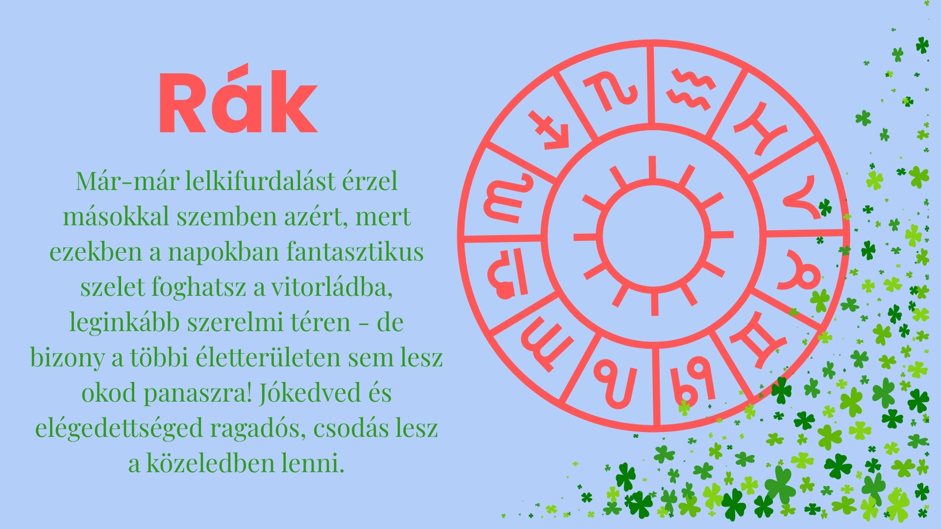 Az előttünk álló hét igazán ígéretes: a Nap, a Hold és a nagy szerencse bolygója, azaz a Jupiter szerencsés találkozására kerül sor a Rák jegyében, ami mindenkit érzelmesebbé, gondoskodóbbá és elfogadóbbá tesznek. A kapcsolatokat és a kommunikációt szimbolizáló Merkúr bolygó az Oroszlánban jár, ami segít, hogy könnyebben kimondd, amit gondolsz. és szükség esetén kiállj a magad igazáért.