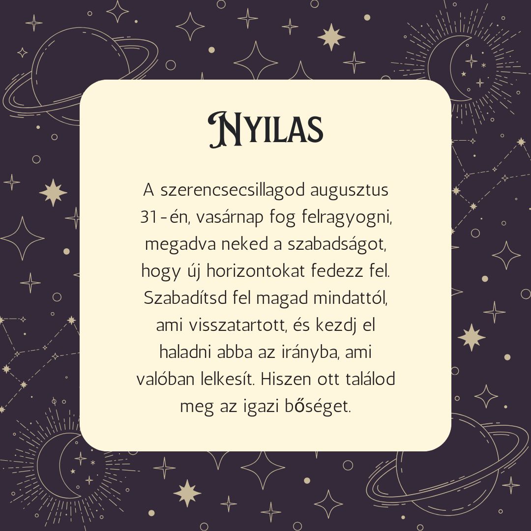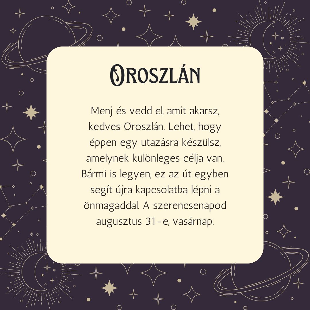 Augusztus 25-én, hétfőn a Vénusz belépett az Oroszlán jegyébe, ahol egészen szeptember 19-ig marad. Az Oroszlán játékos, vidám energiát képvisel, így most a szerencse akkor talál meg, ha azt követed, ami örömet okoz.
