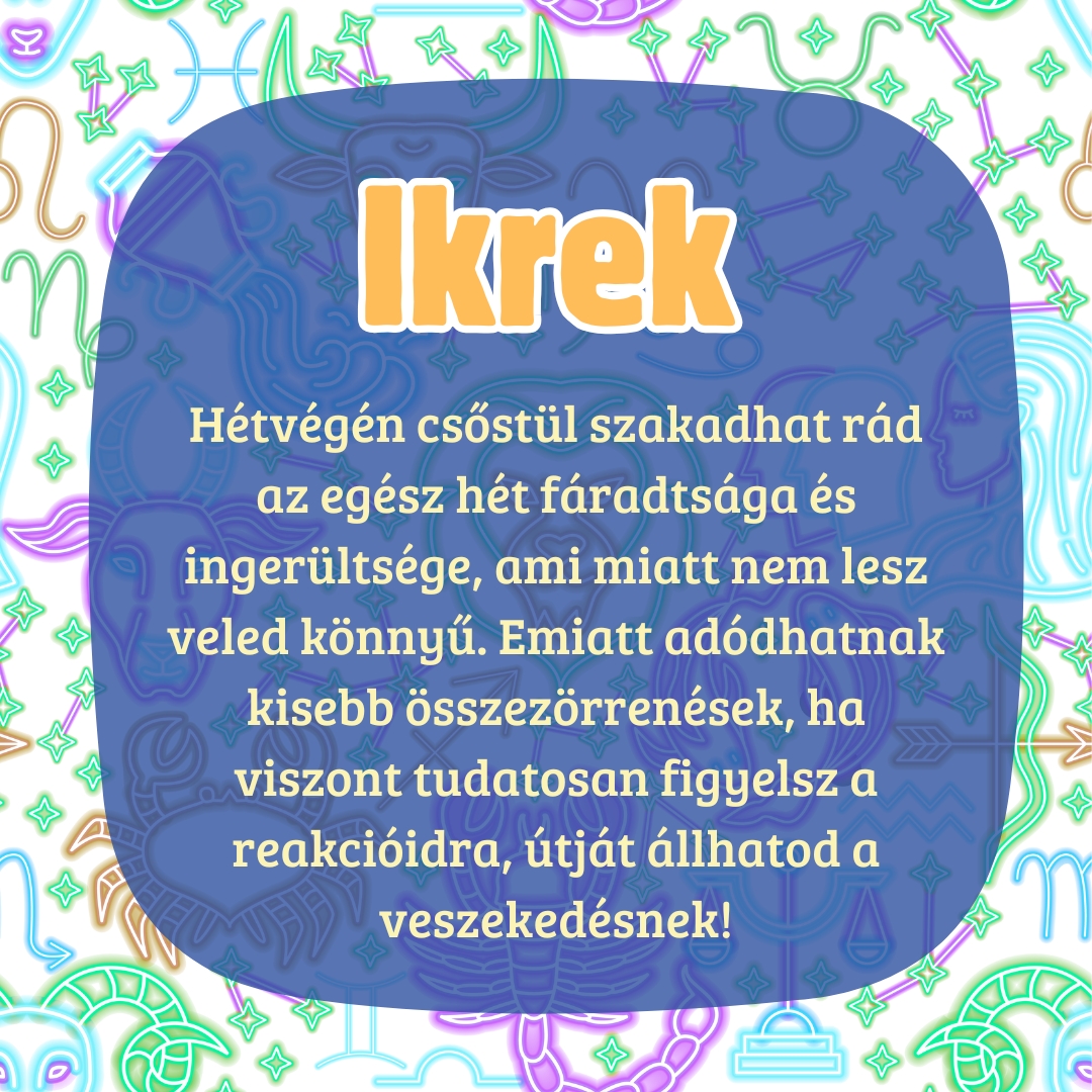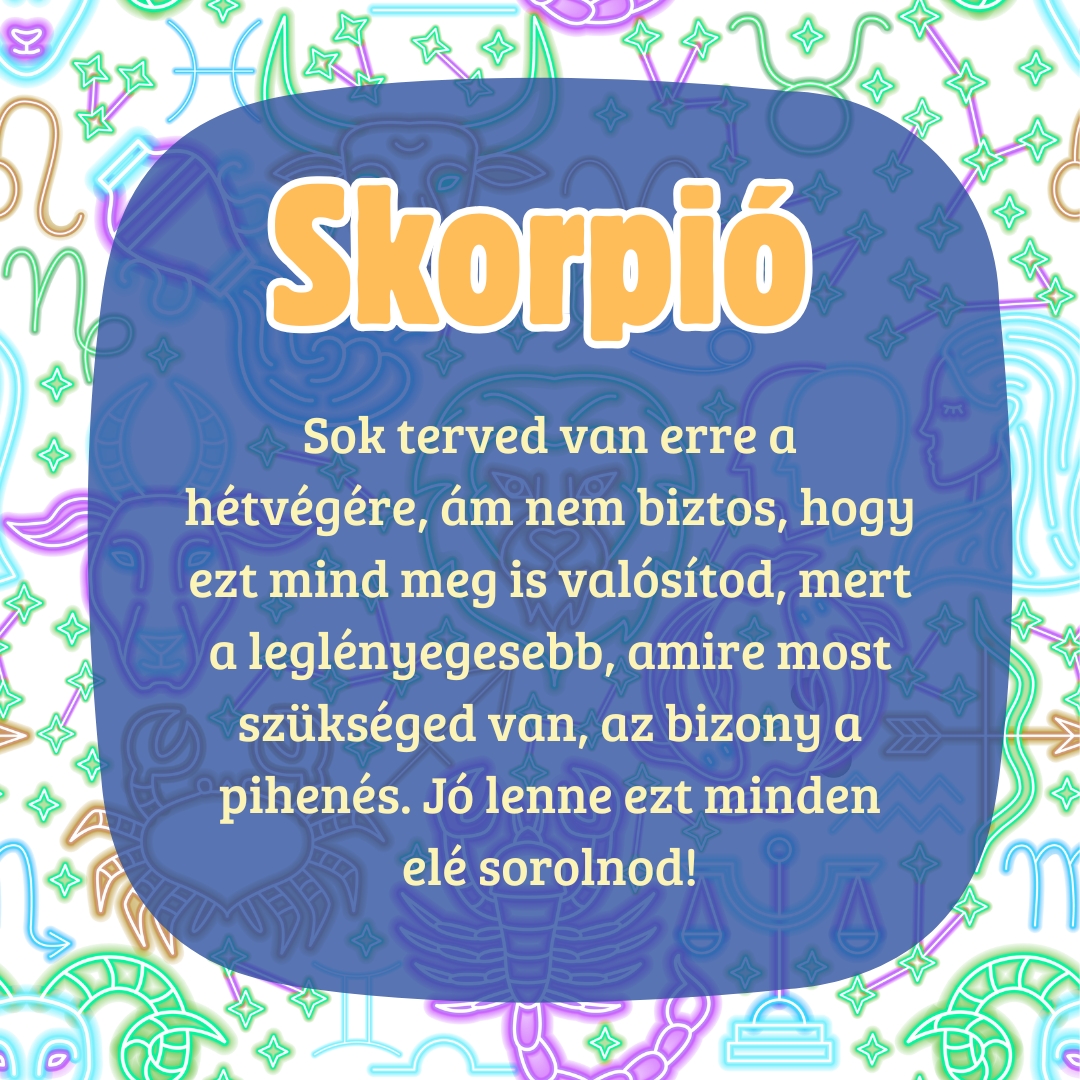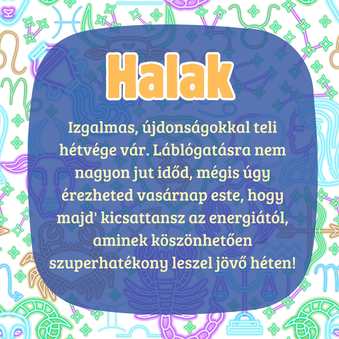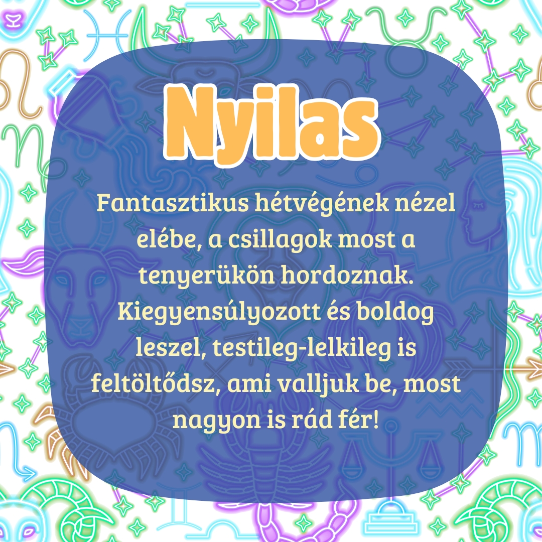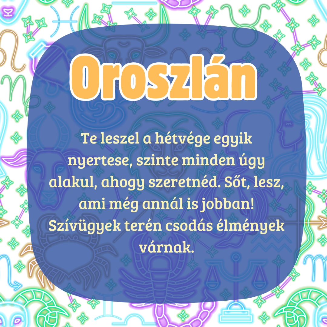 Klassz hétvégének néznek elébe az Oroszlánok, a Nyilasok és a Halak, míg némi bosszúságra számíthatnak az Ikrek, a Mérleg és a Bak jegy szülöttjei.