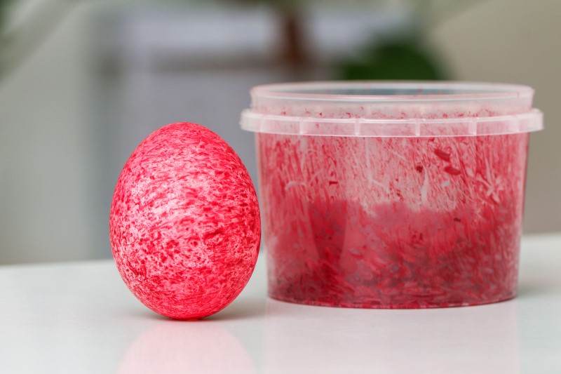Szintén ajánlottak egy jól ismert technikát, amihez fehér zsírkrétára lesz szükségetek: ezekkel rajzoljatok mindenféle mintát a száraz, főtt tojásra, majd ezután fessétek be a tojásokat tetszőleges színű festékkel. A zsírkréta taszítja a festéket, ezért a minták világosak maradnak.