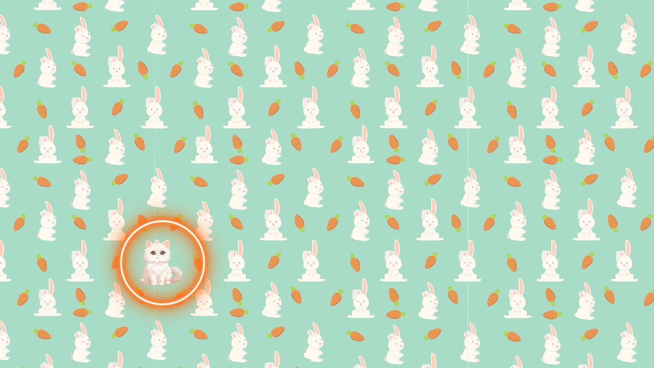 Húsvétkor mindenki a nyuszik érkezését várja, amit ez a dölyfös macska végérvényesen megelégelt. Úgy döntött, neki is helye van a réparágcsáló nyulak között, ezért nem húzta tovább az időt és beférkőzött közéjük. A rejtőzködése nem volt túl sikeres, ha gyorsan leleplezed a hollétét!