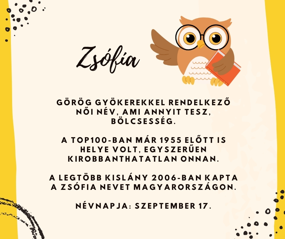 A sorban a negyedik egy olyan csodaszép és felkapott női név, ami bölcsességet jelent – ha hihetünk annak, hogy nevünkben a sorsunk, ez mindenképpen szerencsés indulást jelent egy kislánynak.