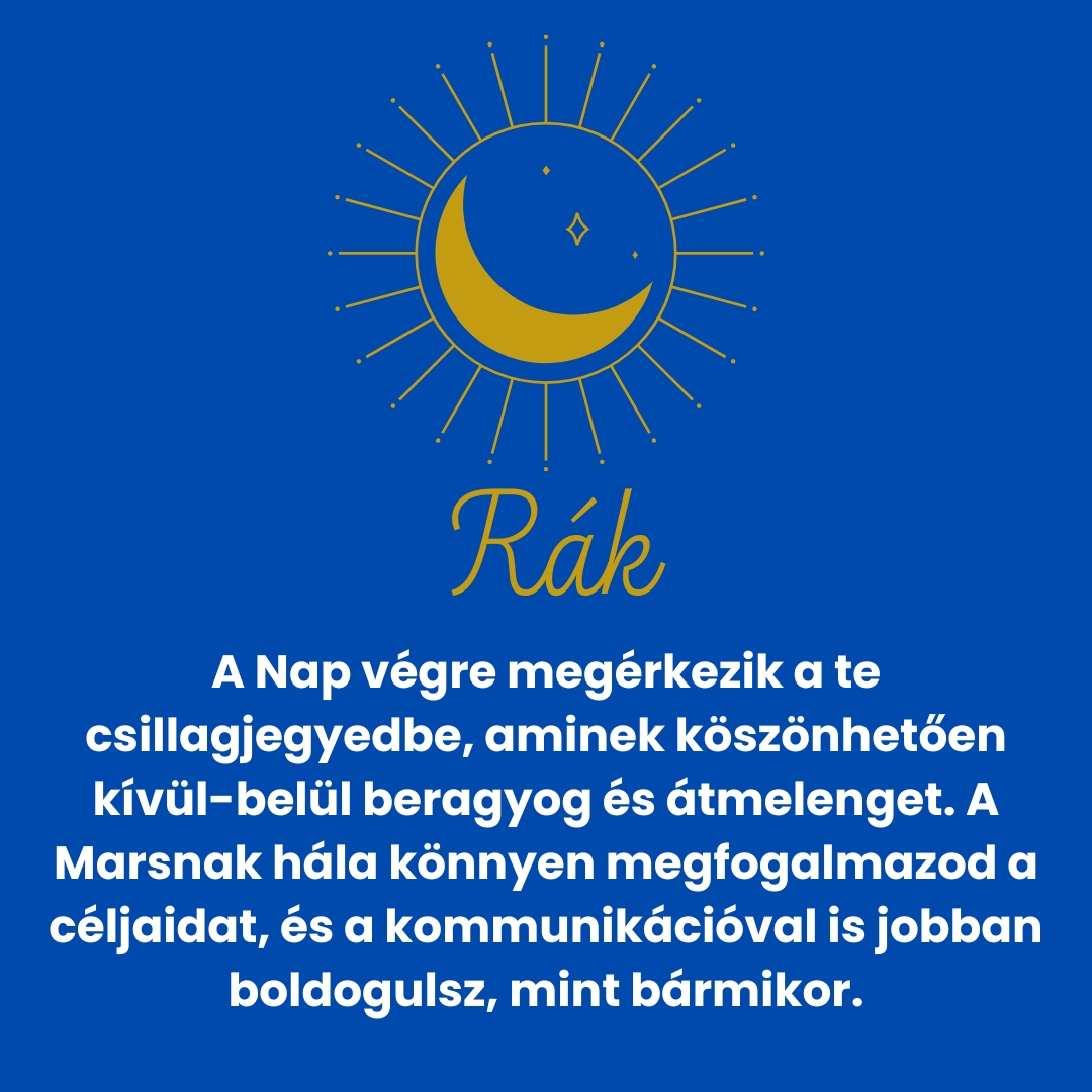 Ez egy olyan időszak, amikor érdemes hallgatni az intuíciódra, kellő időt szánva a nyugalomra és a belső béke megélésére. A Rák jegyét a Hold uralja, ezért ez az egyik legérzékenyebb és legérzelmesebb csillagjegy. Ebben az időszakban lehull a lepel arról, hogy is érzed magad valójában.