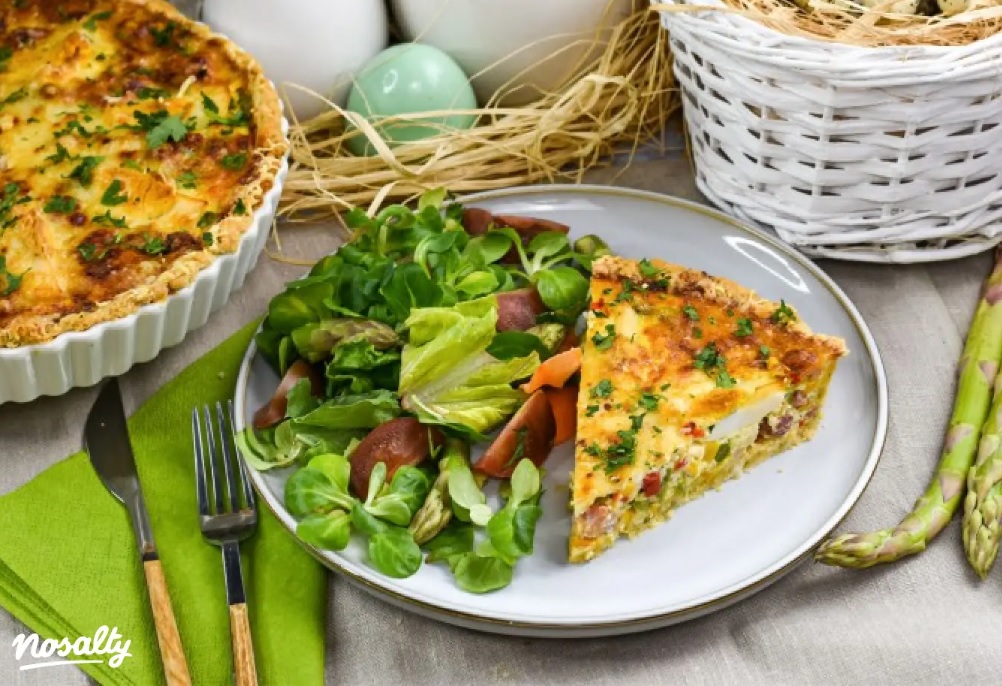 A quiche egy sós pite, ami általában tejszínes-tejes-tojásos töltelékkel készül, amibe kerülhet kolbász, sonka, maradék hús, hagyma, sajt és zöldség. Ez is egy szuper maradékmentő fogás, amit ebédre vagy vacsorára is elkészíthetsz. A következő húsvéti változatban a sonka és a főtt tojás mellett vannak különböző paprikák, koktélparadicsom és spárga is. De ha más zöldségek vannak otthon, azokból is kerülhetnek bele.