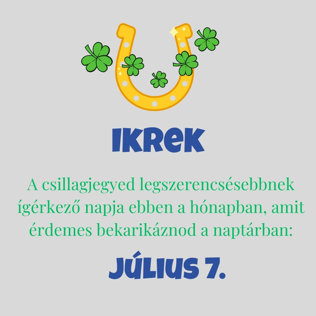 - A hónap első, mindenki számára ígéretes szerencsenapja július 4., amikor a Vénusz belép az Ikrek jegyébe, és mindannyiunkat optimistábbá, kevésbé görcsössé tesz. A Vénuszt a pénzzel, a szerelemmel és az ingatlanokkal összekapcsolódó bolygó, ami az Ikrek jegyében járva új lehetőségeket és nagy reményeket hozhat.
