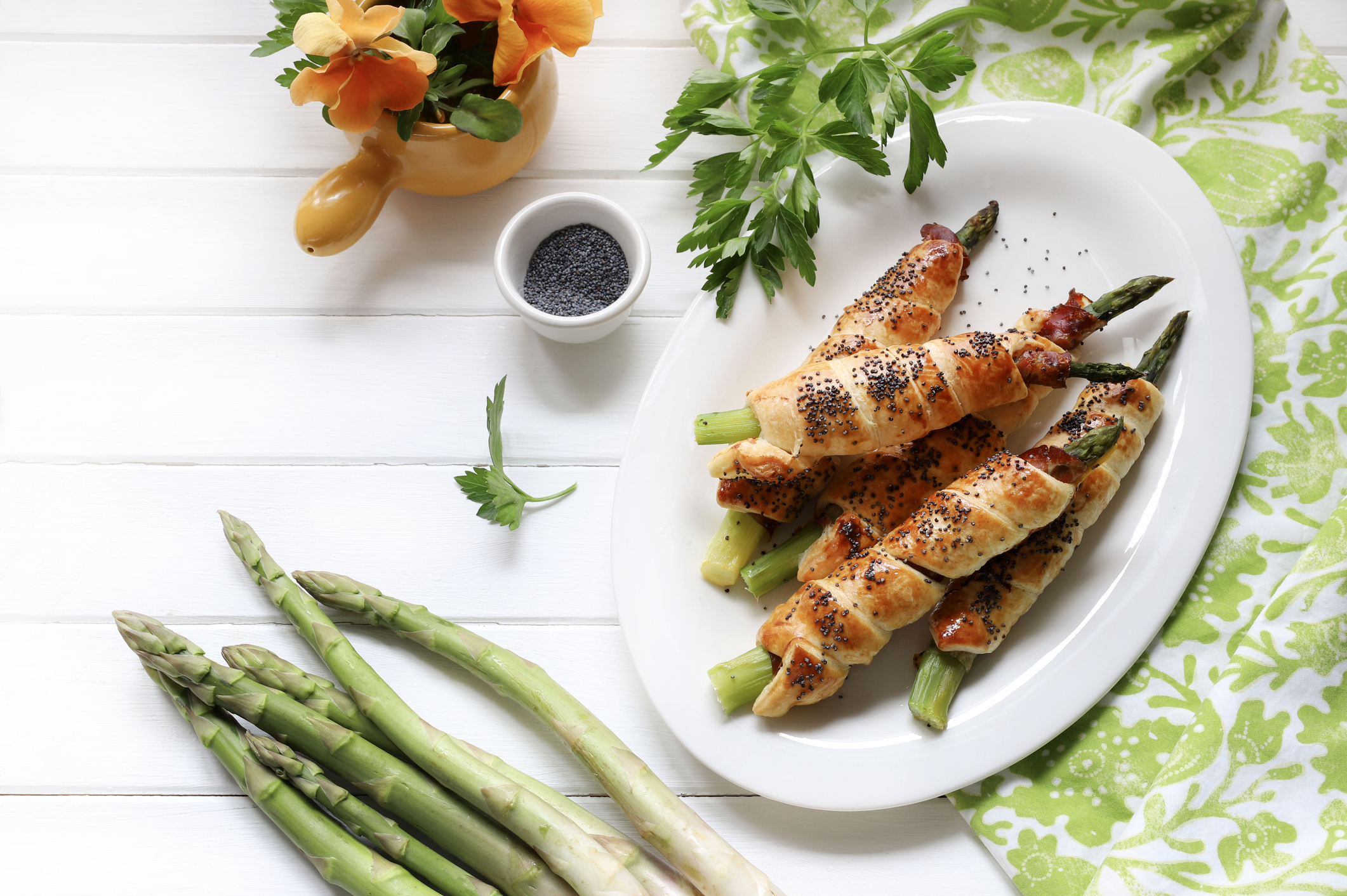 Spárga csavar - Vágj csíkokra egy leveles tésztát és baconnal kombinálva csavard fel egy szál spárgára. Kend meg őket egy felvert tojással, szórd meg szezámmaggal és mehet a sütőbe 15-20 percre. (Fotó: GettyImages)