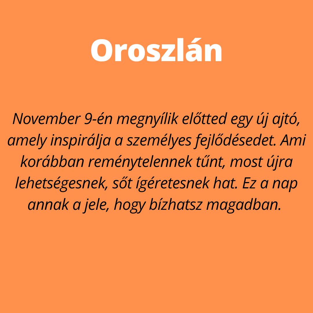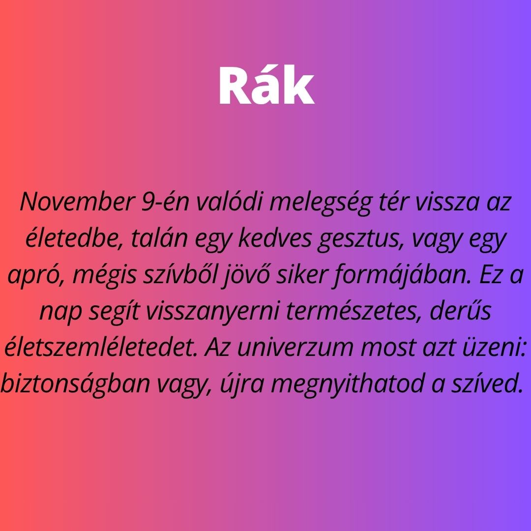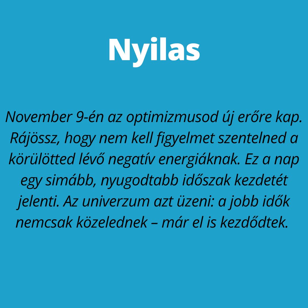 A november 9-ei bolygóállás három csillagjegynek visszaadja az önbizalmat és elhozza azt a mély belső békét, amire már régóta vágytak. Mintha az univerzum egy mély levegőt venne és minden újra a helyére kerülne. Vasárnap három csillagjegy különösen erősen érzi majd a belső támogatást. E három jegy számára egy jobb időszak veszi kezdetét. Az igazi fény visszatér az életükbe, és megmutatja az utat egy reménytelibb jövő felé.