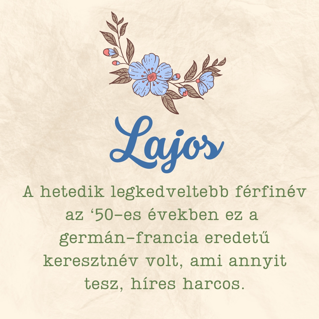 - A 64. helyen állt abban az időben az Alajos név, ami germán-latin gyökerekkel rendelkezik, és azt jelenti, teljes egész, nagy tudású.